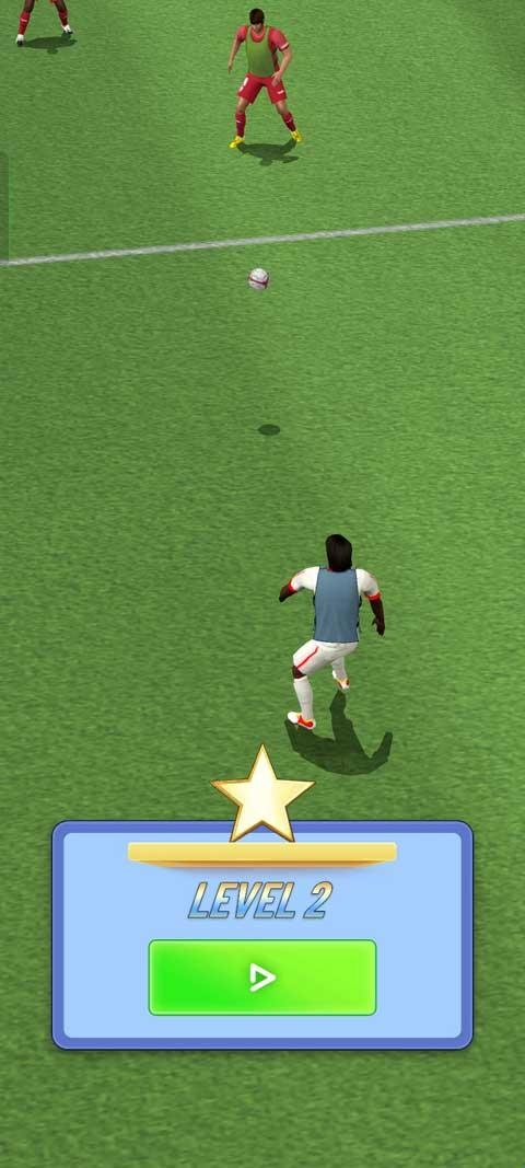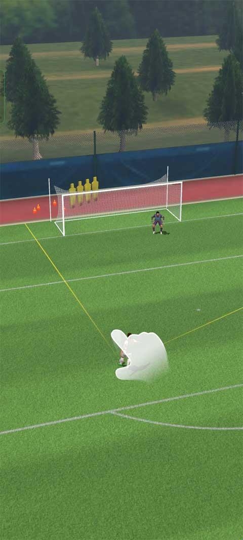 1、游戏的开始会有简单的新手指导,玩家需要根据屏幕上出现的三角区域,制作出最好的踢球抛物曲线,确定好抛物曲线之后,就在三角区域用手指滑动一条白色的实线,这样后面运动员就会根据这条曲线去踢球过去。