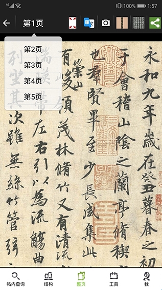 3、单字大图页提供“比一比”功能,通过摄像头叠加字的边缘线对比临写的书法与原帖的差距