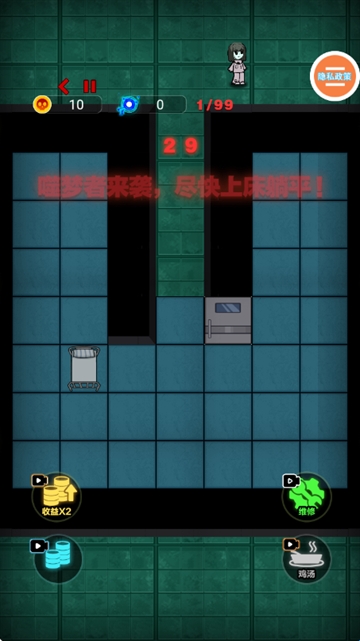 3、解锁更多的电机、炮台道具,天黑之后布局防线,抵御一波波猛鬼攻击,守住宿舍就算胜利。