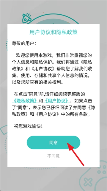 1、首先打开游戏,阅读并同意《隐私政策》和《用户协议》;