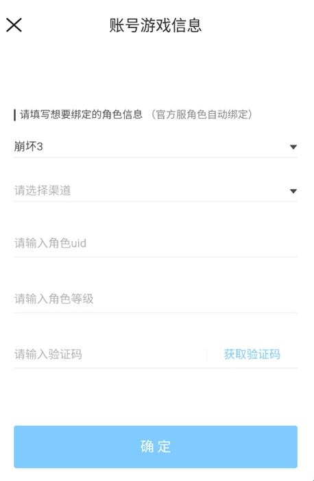 4、输入想要绑定角色的信息,如游戏、渠道、uid、等级、和验证码,点击确定即可。