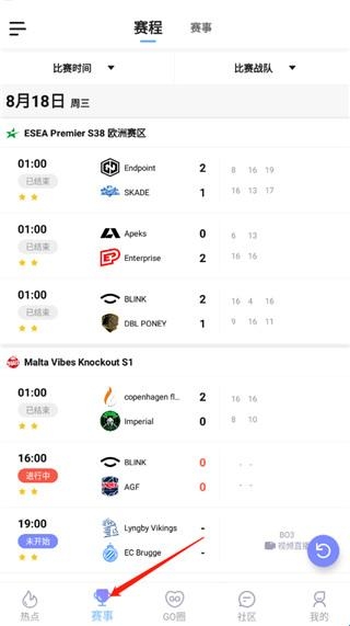 1、打开在本站下载的5e对战平台手机版,点击赛事,玩家可以官看各种时间段的赛事