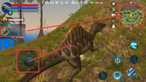 2、根据右上角地图里窃蛋龙的位置标记,用左侧摇杆操控恐龙移动,前往目标区域找窃蛋龙。