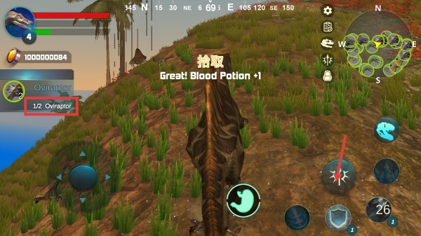 3、找到窃蛋龙后攻击,击杀后屏幕提示【拾取-Great!-Blood-Potion-+1】,此时任务进度到【1/2-Oviraptor】,继续推进。