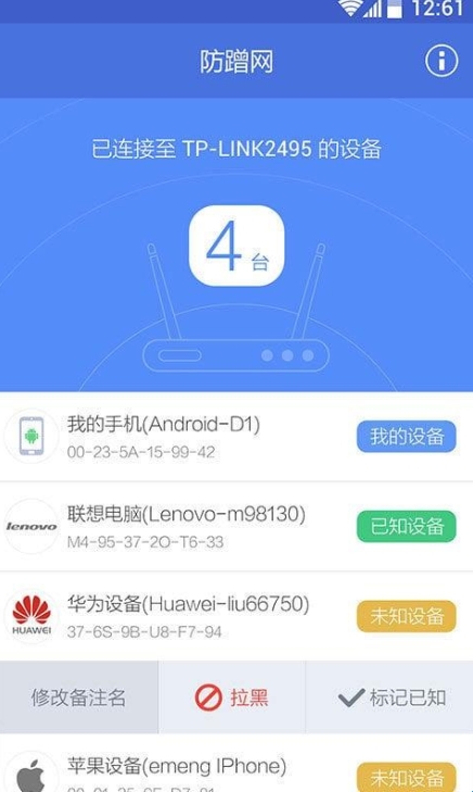 3、支持防蹭网功能,当有陌生终端连上家中路由器,APP会发送通知消息,用户可以对非法侵入的终端进行禁用,防止蹭网,还支持用户手动扫描连接路由器的所有终端,并对每个终端命名和设置权限;