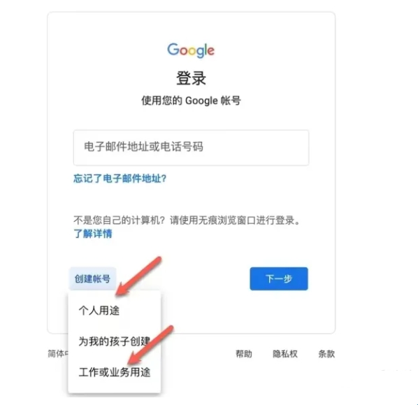 点击访问Goolge的注册页面(请确认能访问Goolge,推荐使用Chrome浏览器),在创建账号时推荐选择个人使用、工作或业务用途选项。