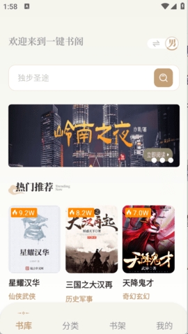一键书阁app是一款广受好评的小说阅读软件。软件有科幻、武侠、都市、游戏等题材的小说资源,并且还会在搜索框下方推荐热门搜索内容,均来自真实用户的搜索记录,其质量非常有保障。软件内所有书籍的更新速度都非常快,并且都能免费阅读,喜欢的小伙伴们快快下载吧。