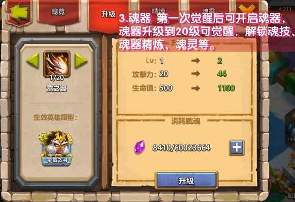 3、魂器第一次觉醒后可开启魂器,魂器升级到20级可觉醒,解锁魂技、魂器精炼、魂灵等。