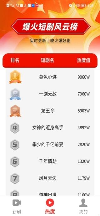 3、在热度页面,可以查看爆火短剧风云榜,了解热门作品。