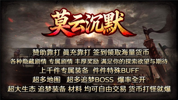 莫云沉默是一款经典复古的传奇向角色扮演游戏。游戏旨在带给玩家原汁原味的传奇游戏内容,在这里赞助、真充、装备、材料全靠打,并且爆率全开,玩家能感受到极速升级的战力飙升体验,也能体验刀刀暴击的爽快感。游戏职业丰富,地图副本众多,活动持续更新,喜欢的朋友们快在游娱下载吧。