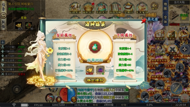 1、酒神福袋:消耗元宝和酒袋进行提升,可以获得攻魔道属性,并且还能提高打怪爆率!