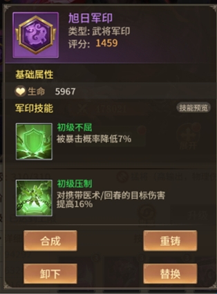 旭日军印:可增加基础属性,并附带一到两个低、中级兵法技能