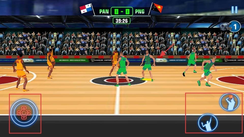 2、借助左侧操控盘控制球员移动,右侧按键对应投篮等动作,在赛场上灵活操作。