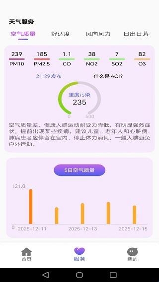 4、在服务页面,还会呈现本地空气质量、日出日落等其他信息。