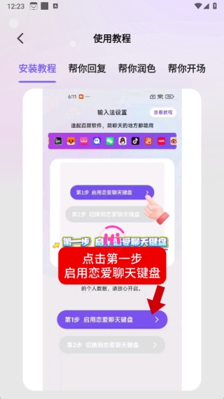 2、使用前可通过右上角教程入口学习安装步骤、智能回复、文本润色及开场白生成等核心功能。