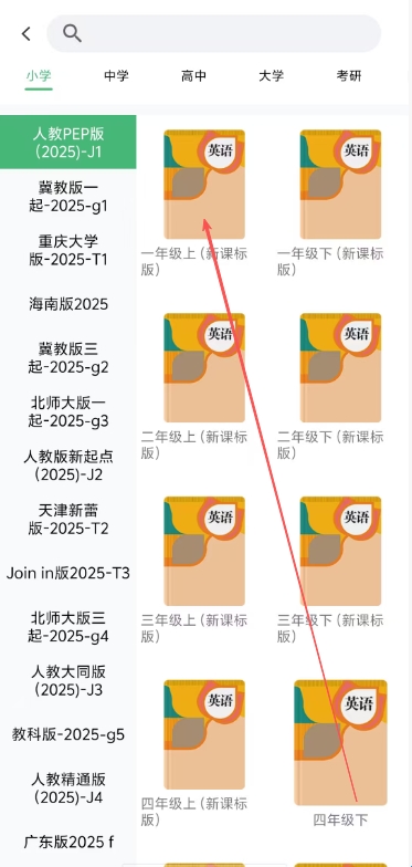 2.之后在弹出的页面中,用户可以学习年级、版本进行选择,该能直接输入关键词点击教材即可切换。