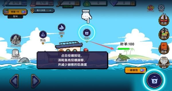 3、操控角色前往投喂区域,点击投喂按钮消耗鱼肉满足顾客需求,减少其饥饿度以获取对应收益。