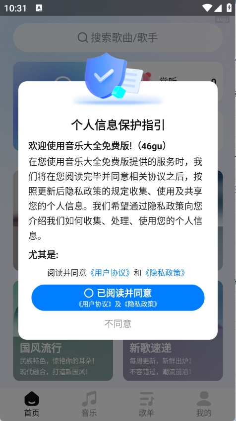1、用户在本站下载音乐大全免费版app,点击同意。