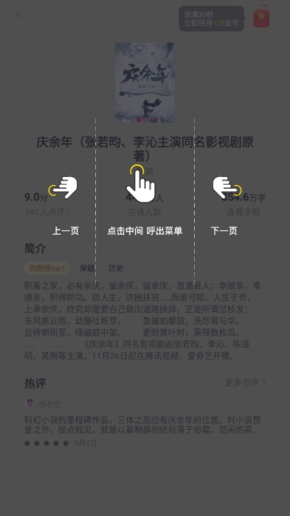 3、点击屏幕中间可呼出菜单,滑动左右两边可进行翻页