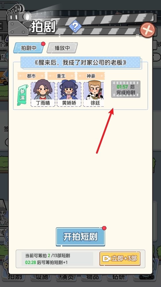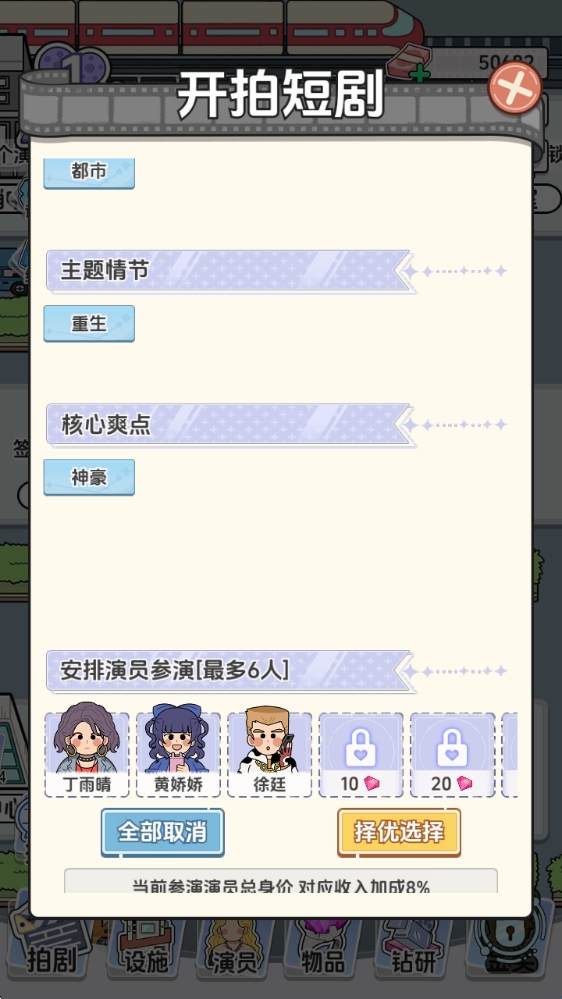 2、接着就可以着手拍摄短剧了,选择好题材、演员后,设置好投入资金和剧名后即可开始。