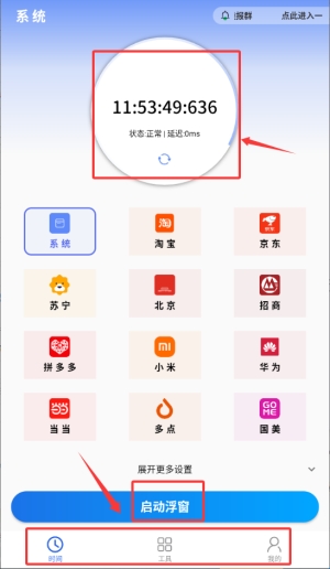 2、主界面可查看精准时间,点击启动浮窗开启悬浮显示。