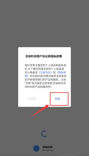 1、启动浮动时间应用,先在协议页面点击同意按钮进入程序。