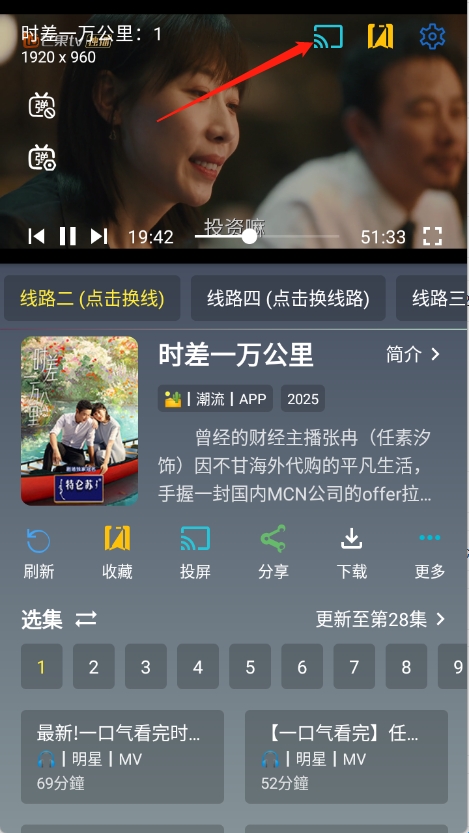 1、点开想看的影片进入到播放页面,点击右上角的投屏。