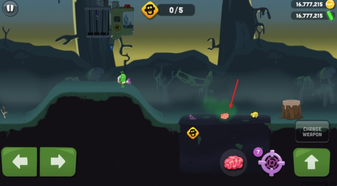 2、进入之后,通过左侧按钮移动,找寻这样的位置放置脑子,吸引僵尸出现。
