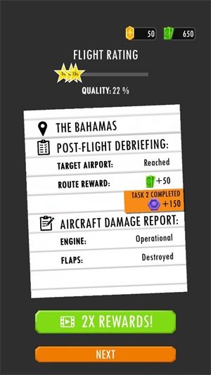 3、降落挑战,玩家要在目标机场进行完美降落。飞行结束后的分数会通过考虑各种飞行指标来显示降落质量。