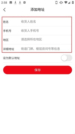 4、在【添加地址】页面,填写信息后点击【保存】按钮可完成收货地址的添加。