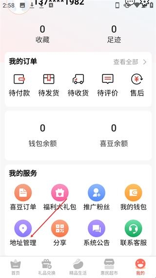 2、在【我的】页面,点击【地址管理】选项可进入地址管理页面。