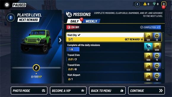 4、点击右上角的暂停按钮可以查看需要完成的任务,完成每日任务和每周任务都能获得奖励。