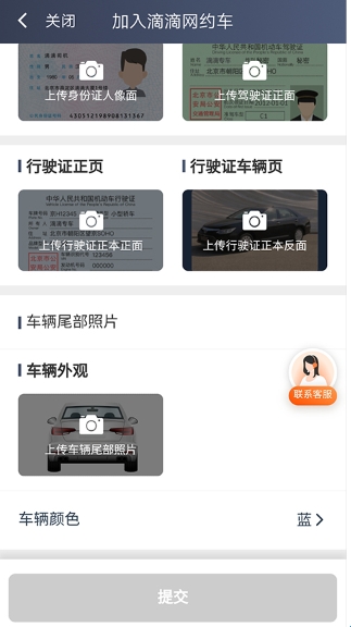 5、依次上传身份证人像面、驾驶证正面、行驶证正本正面和反面,以及车辆尾部照片,选择车辆颜色,之后点击提交等待平台审核通过即可注册成功。