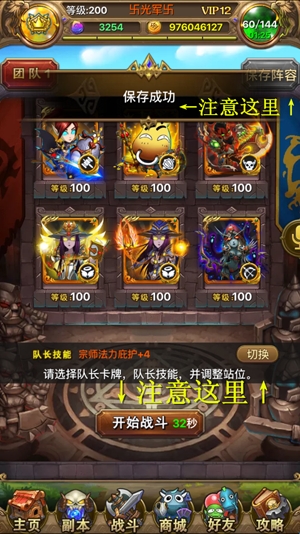战斗队伍:这里有个细节,队伍是需要保存的。在左上角那个【保存阵容】,一定记得按...还有可以切换队长技能的,不过无所谓的,上物攻法攻随便什么打好了,这本还是比较菜的。