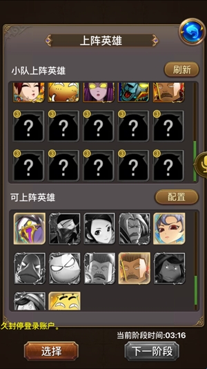 选卡:这个时候队长就要注意了,选完之后下方有个选项【下一阶段】。如果看组员齐活了,就可以点击了。别在那瞎磨叽!关于选卡的方案,不管是队长还是组员,哀木涕和虔诚闭月,必带。其他dps治疗随意挑狠的上。