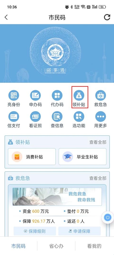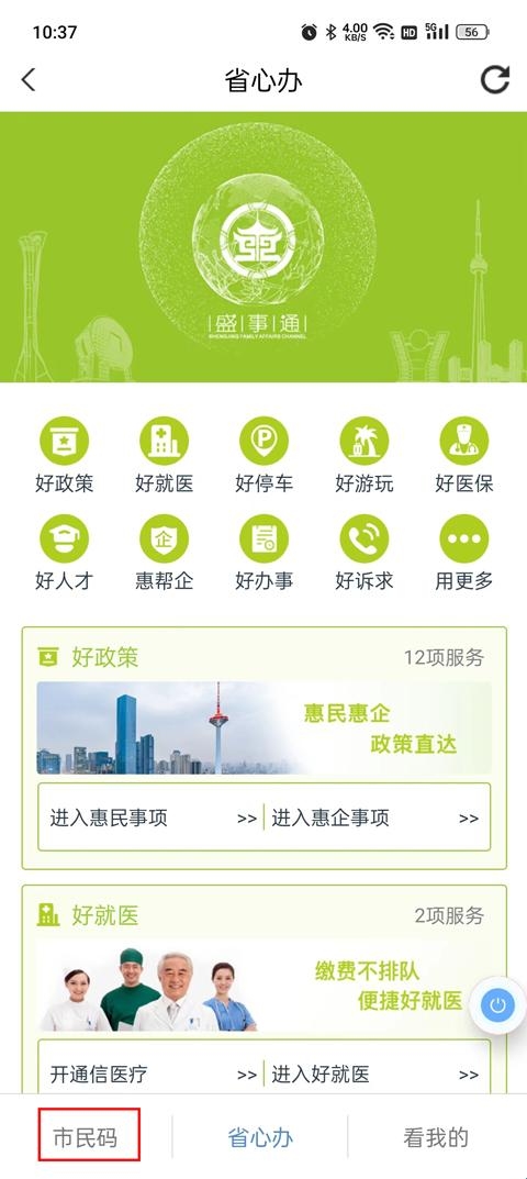 1、下载安装进入到盛事通App页面,点击选择左下角市民码项目。